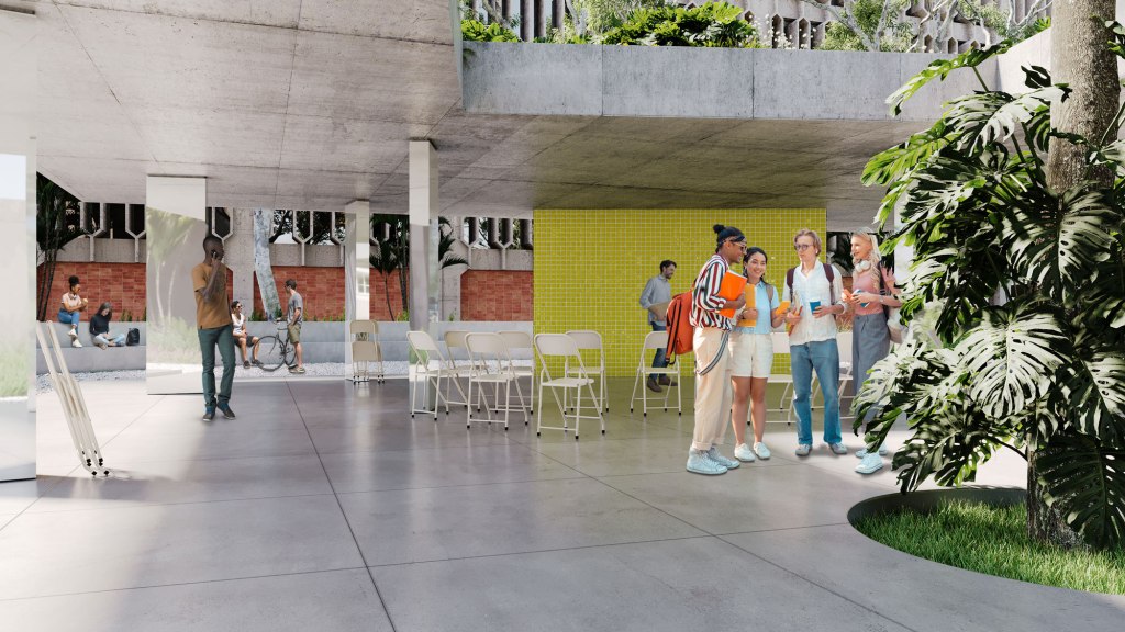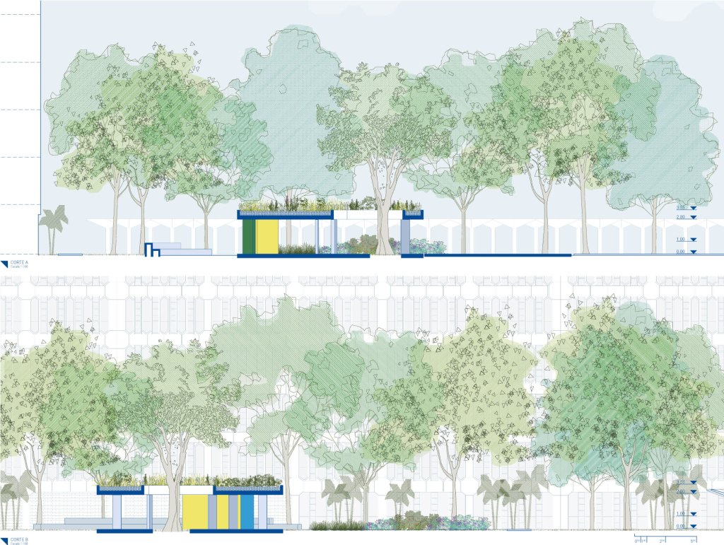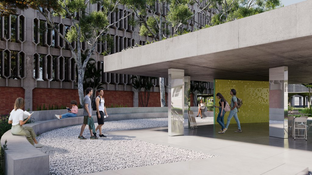 Lo techado y lo destechado constituyen un espacio único versátil y adaptable capaz de albergar distintas actividades y usos: brindis, reuniones sociales, clases, talleres, ferias, exposiciones, conciertos, conferencias. El proyecto construye una plaza techada que sirve de umbral de acceso, espacio de tránsito y de permanencia, un lugar que vincula los edificios y jardines que lo rodean. Así, El cuadrado es una plaza-puente que propicia el encuentro, la interacción y el intercambio.