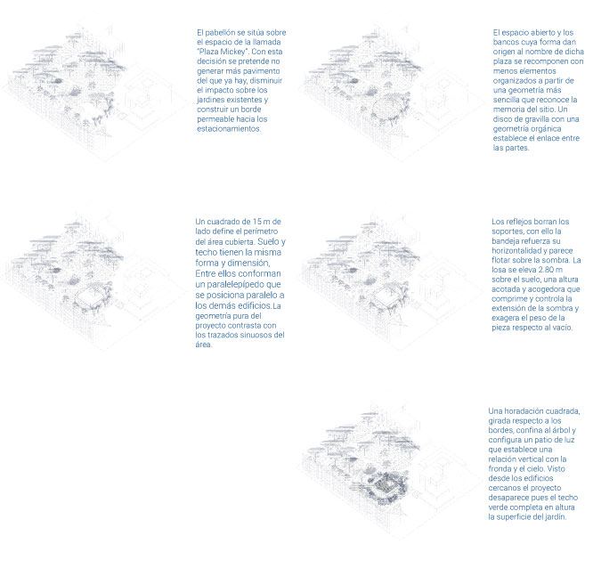 Con pocos elementos se pretende lograr una intervención contundente desde los puntos de vista formal y espacial. Rodeado de edificios de distintas épocas, funciones y estilos se busca crear un lugar que por su sencillez se integre al conjunto sin buscar protagonismo, pero imponiendo su propio orden y carácter. Formas puras, geometrías claras y materiales expresivos son la clave de un proyecto que se resume en dos planos horizontales y un volumen vacío entre ellos, donde la sombra es su razón de ser.